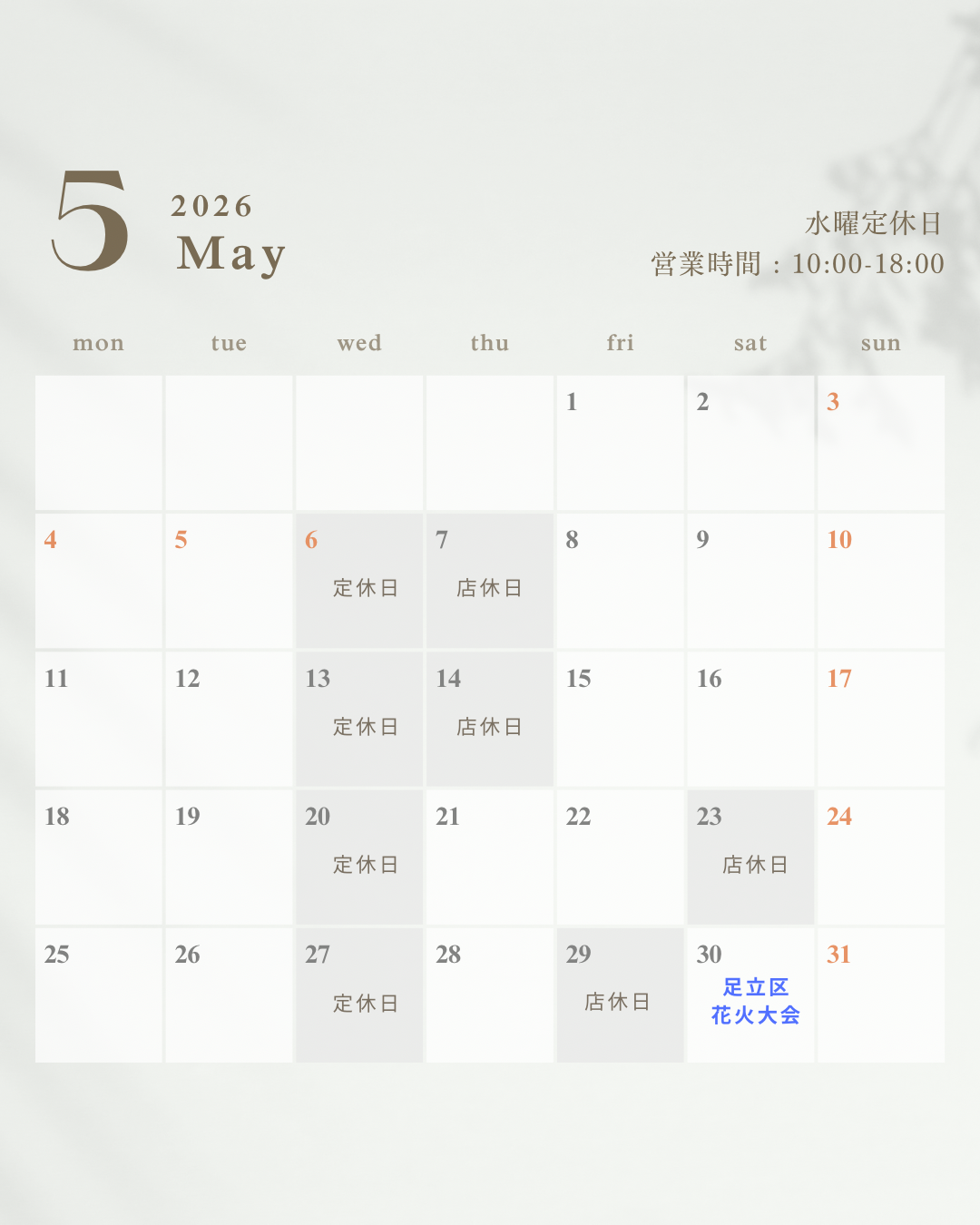 7日(木)・14日(木)・23日(土)・29日(土)は、誠に勝手ながら店休日とさせていただきます。